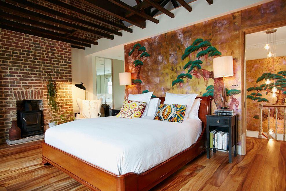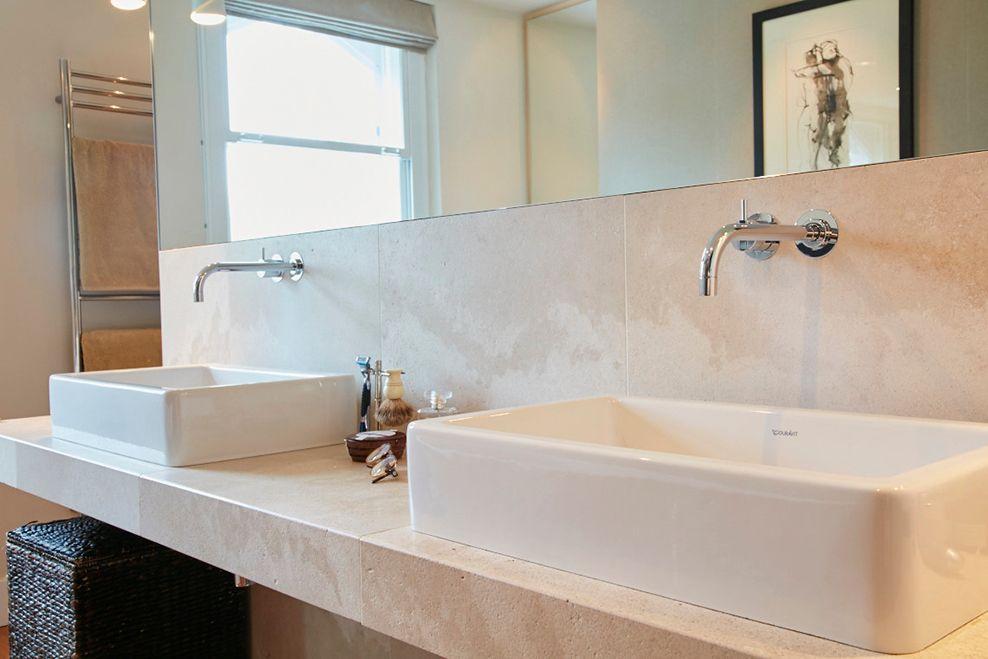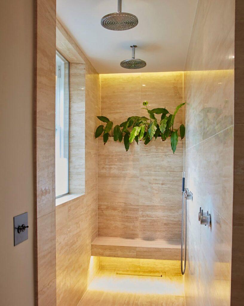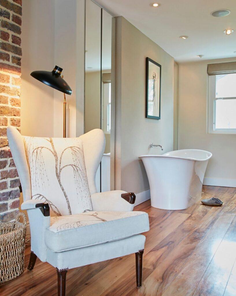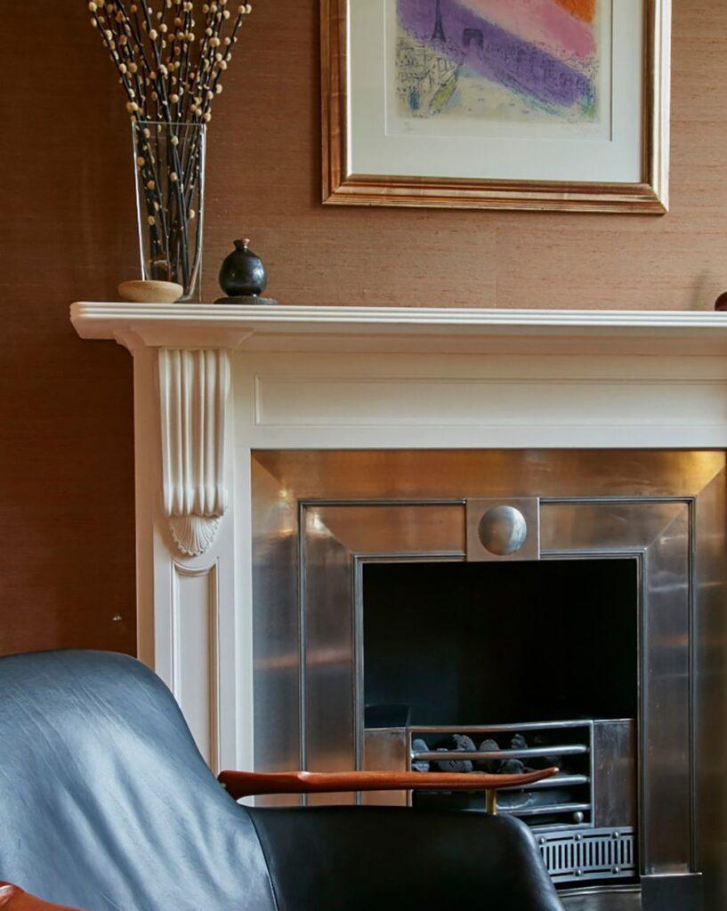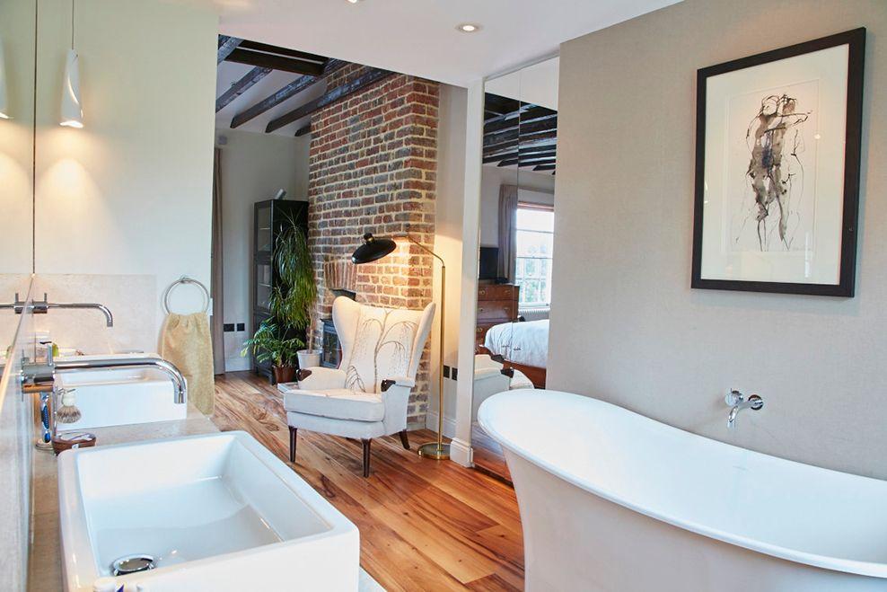A conversion of a Grade II listed house, Eastheath House gave us the opportunity to mix traditional styles with a raw, earthy, nature focus. The client was inspired by Balinese architecture, so we echoed this through a range of touches. The main bedroom suite, for example, has an open plan bathroom where you can sit and relax by the fireplace, chatting with the person in the bath or sharing the double shower. We brought greenery into the shower to connect the experience with the views out over Hampstead Heath, frosting the glass at half height so that those showering can still enjoy seeing the heath while doing so.
