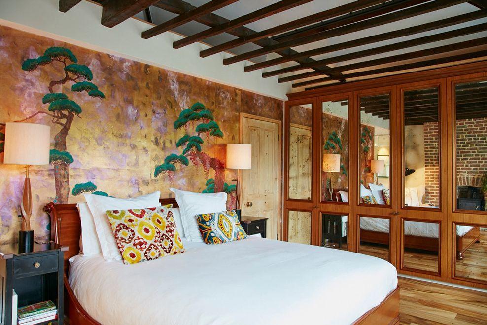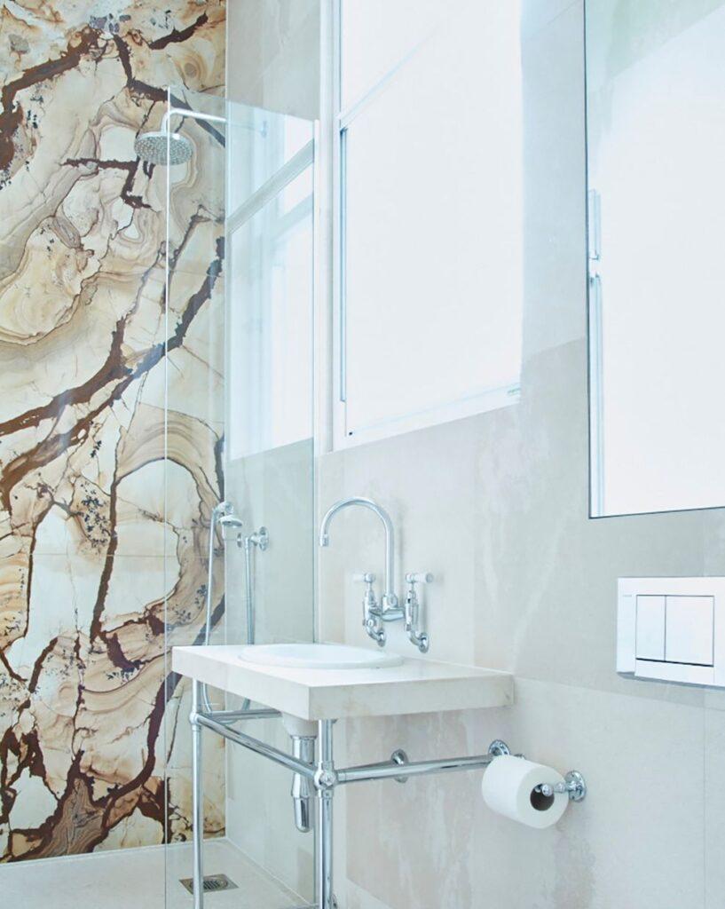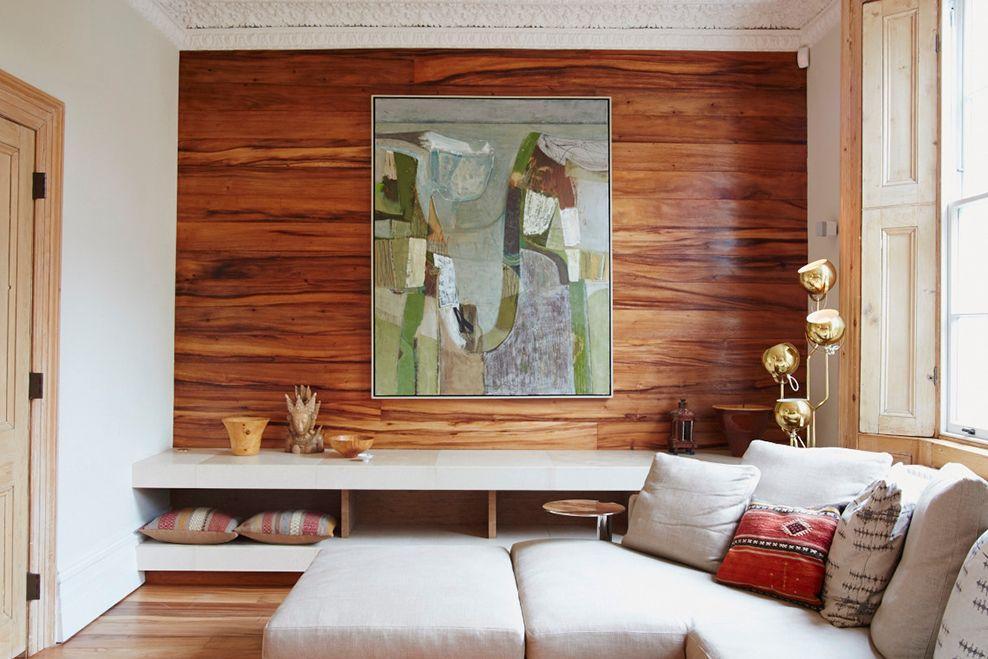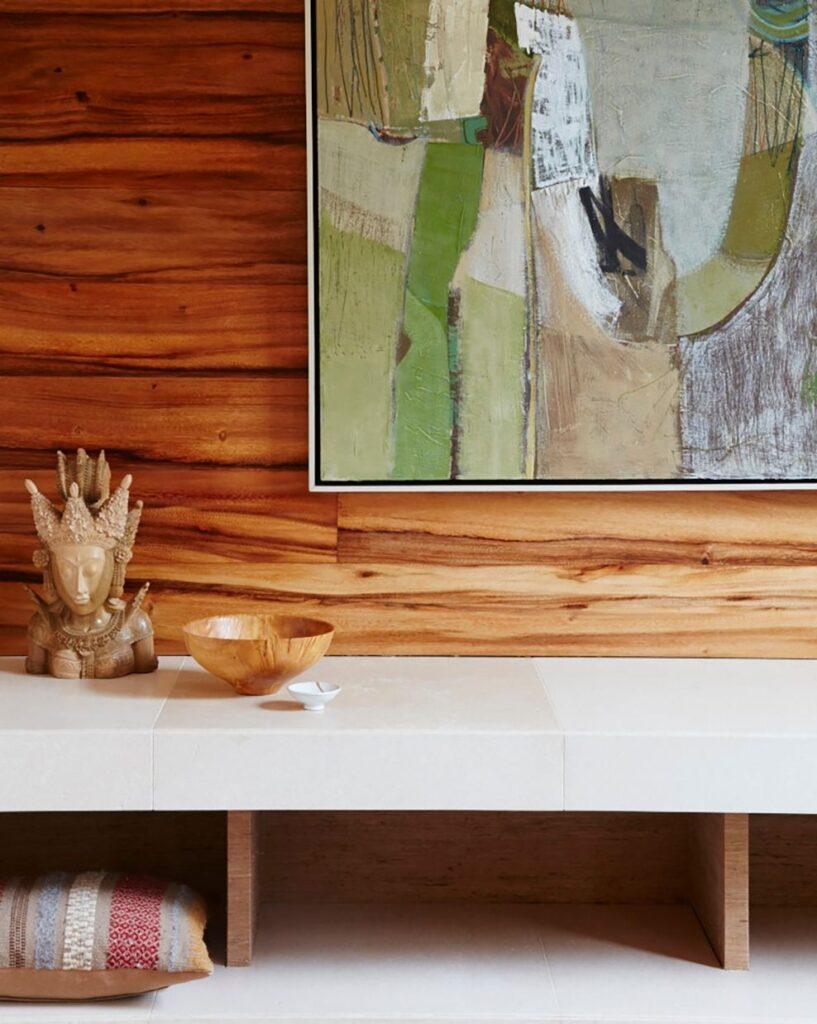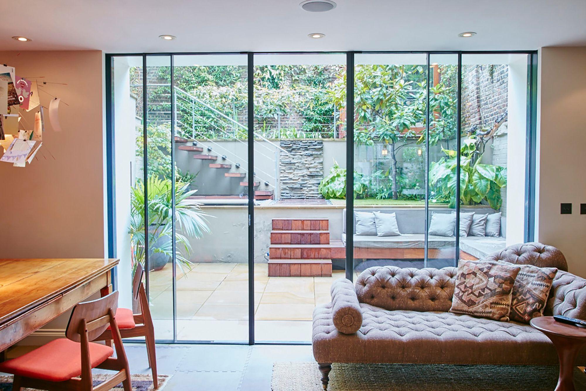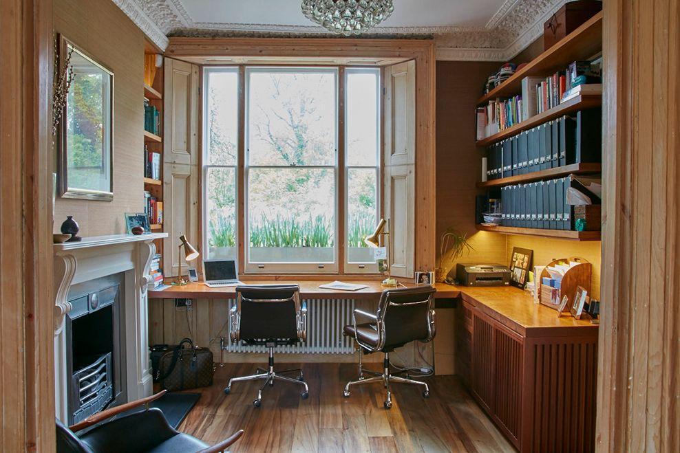 A conversion of a Grade II listed house, Eastheath House gave us the opportunity to mix traditional styles with a raw, earthy, nature focus. The client was inspired by Balinese architecture, so we echoed this through a range of touches. The main bedroom suite, for example, has an open plan bathroom where you can sit and relax by the fireplace, chatting with the person in the bath or sharing the double shower. We brought greenery into the shower to connect the experience with the views out over Hampstead Heath, frosting the glass at half height so that those showering can still enjoy seeing the heath while doing so.