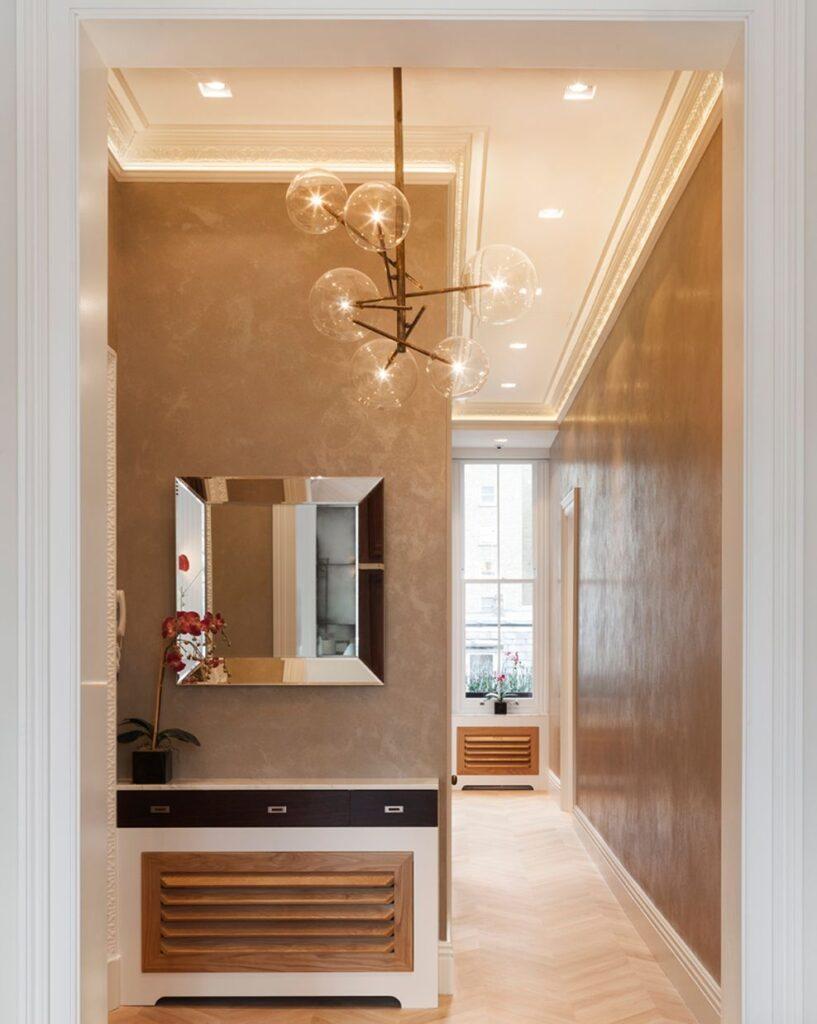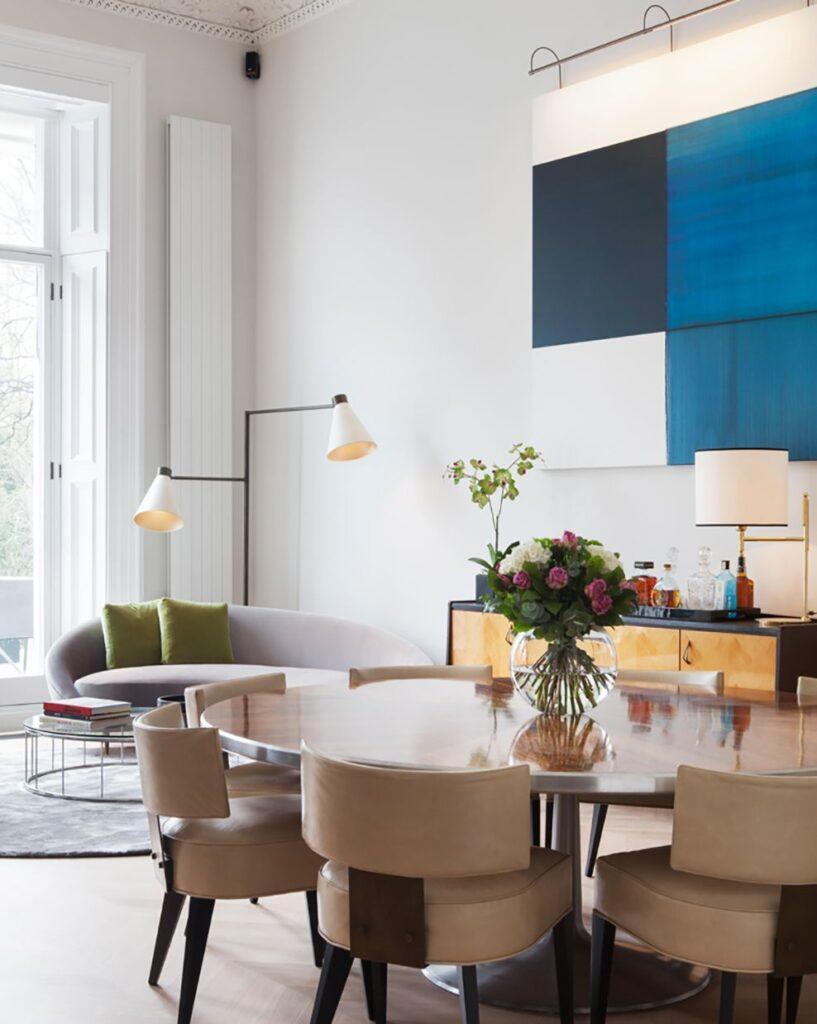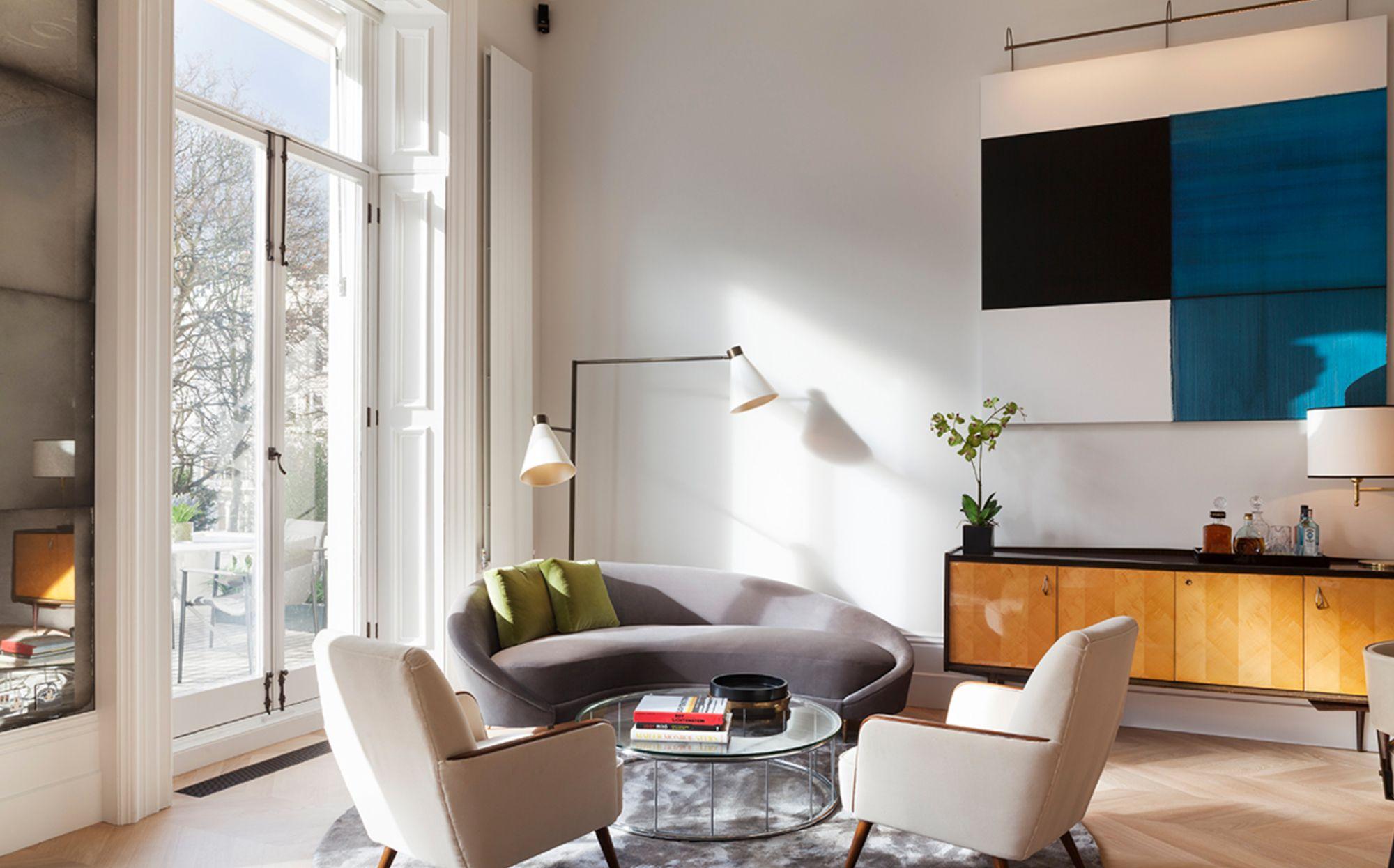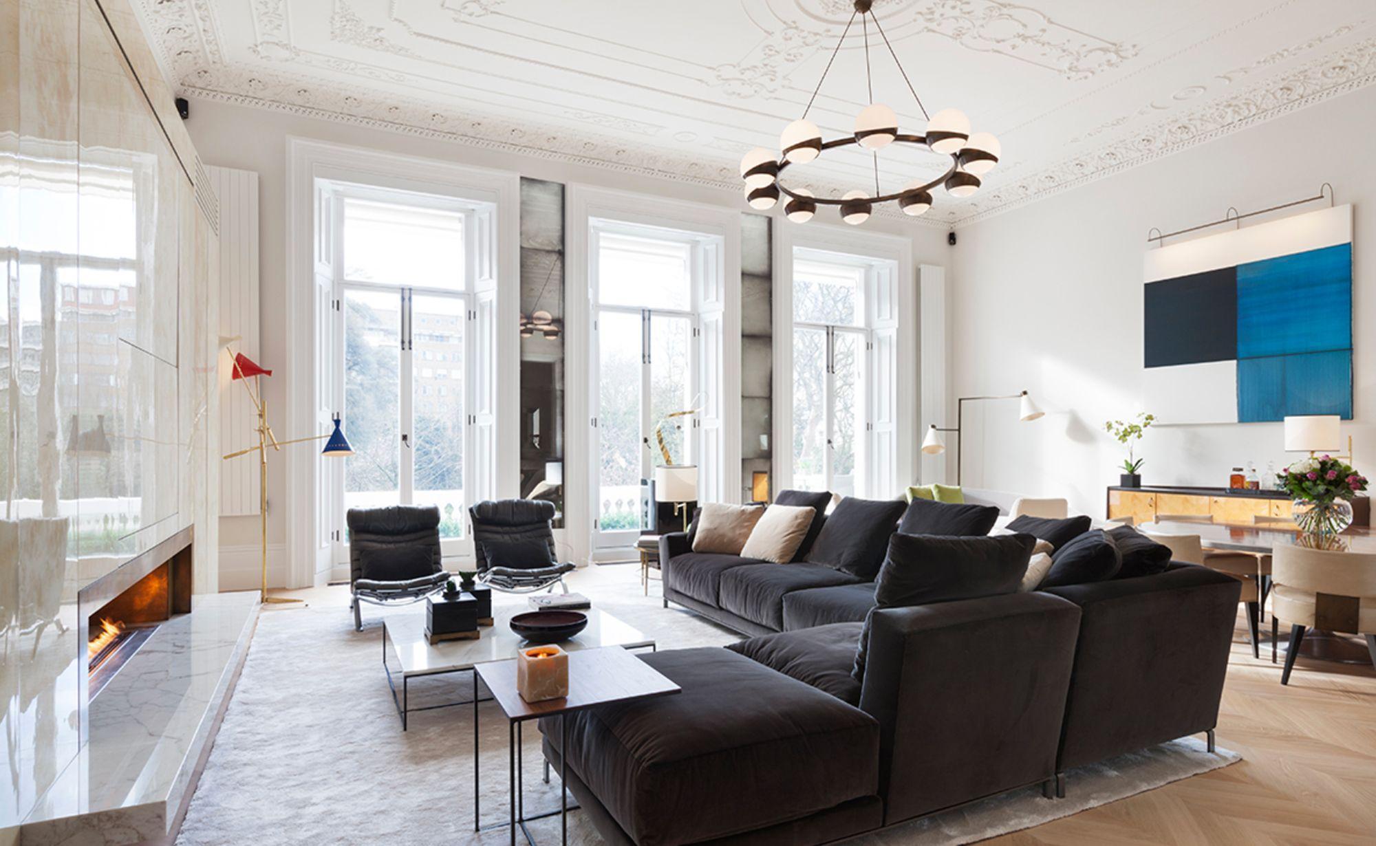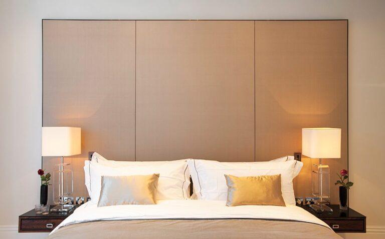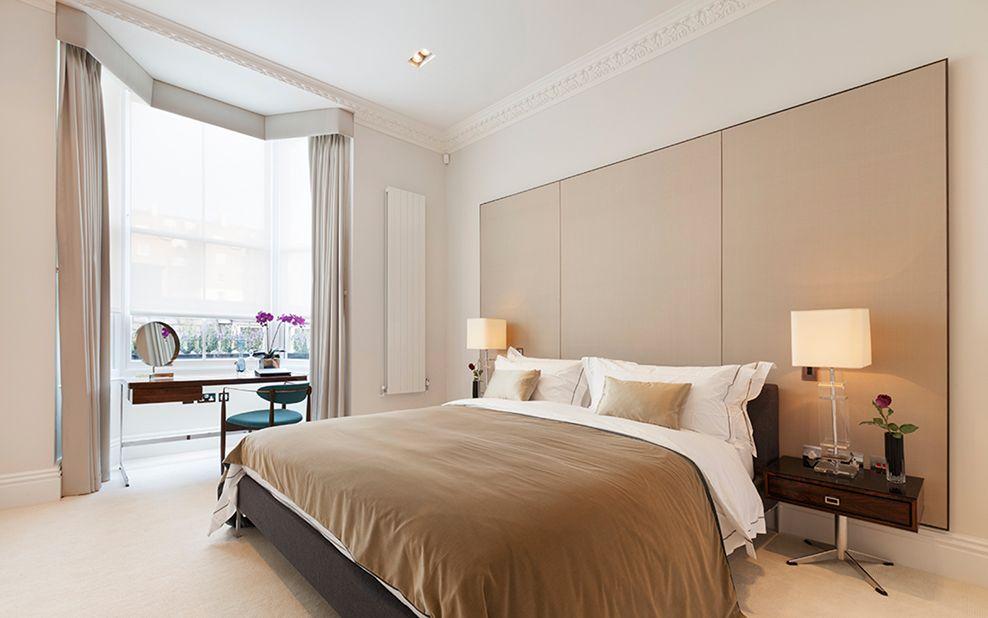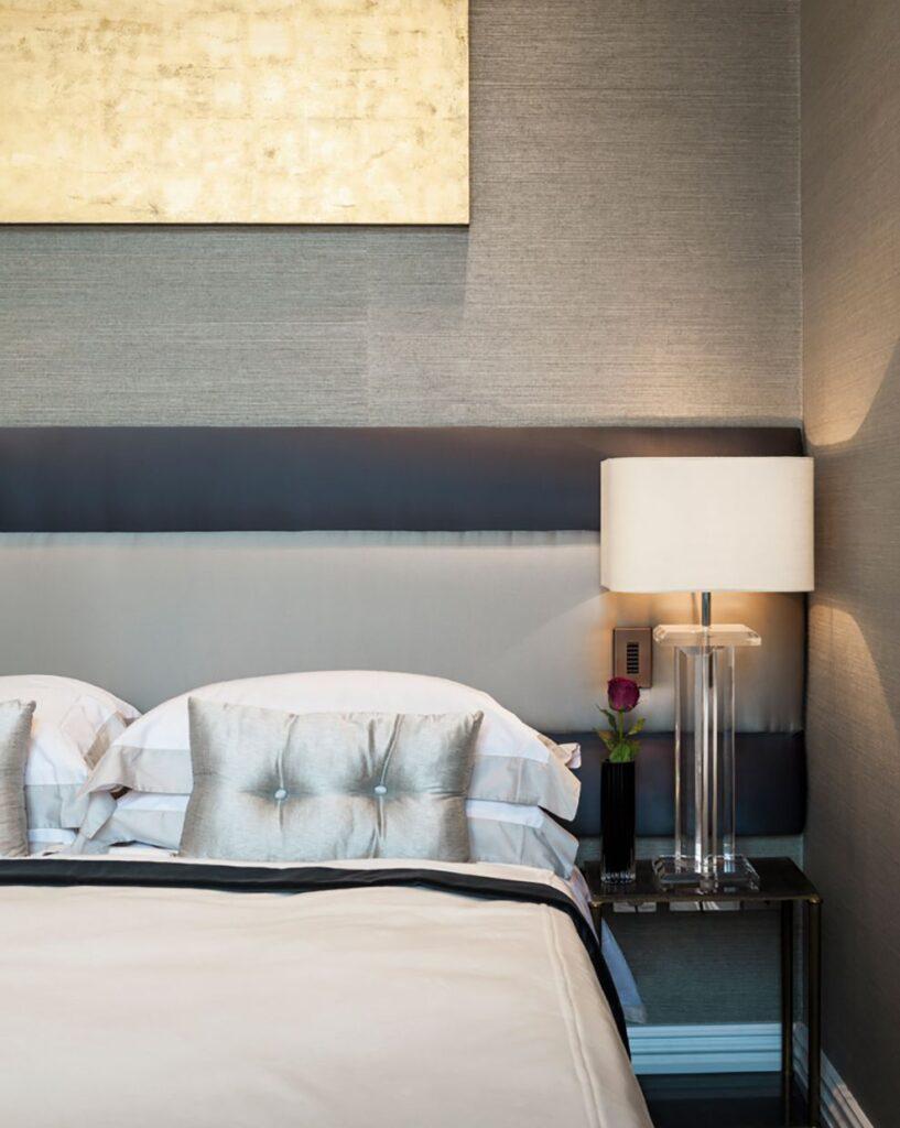 At Queensgate, we’ve balanced luxurious modern furnishings with the beautiful regency ceilings to create a gentile, graceful feel to the home. Comfort meets style head-on in this property. The huge, floor to ceiling windows, spacious living area and high ceilings mean that we could bring in darker colours for the sofas and chairs – something that not every space can pull off! In the bedrooms, meanwhile, we played with golden and silver tones to add a sense of warmth and timeless luxury.