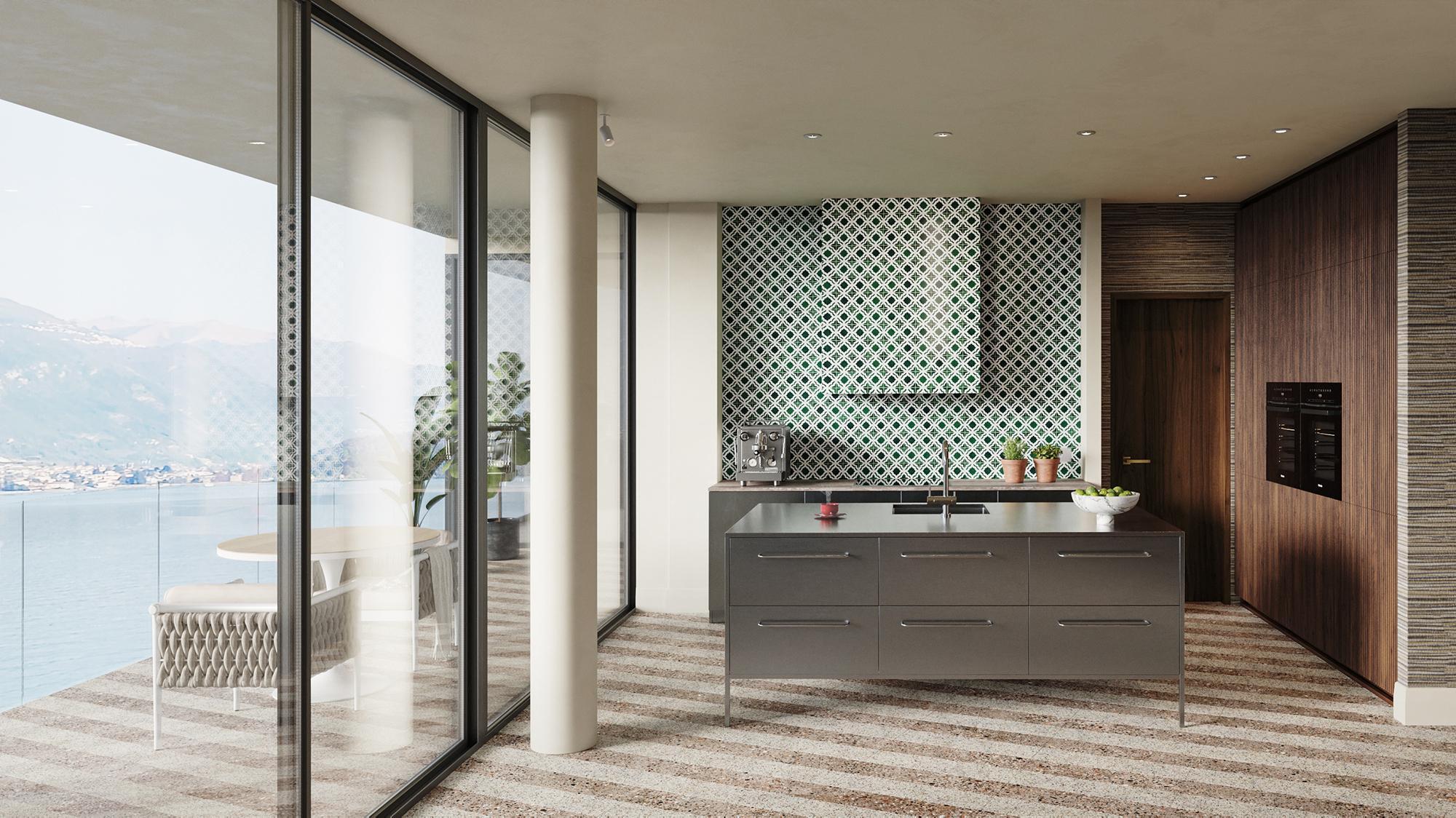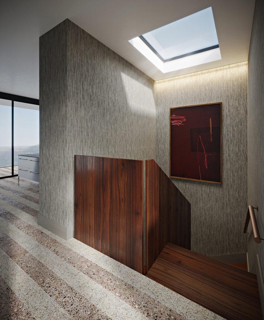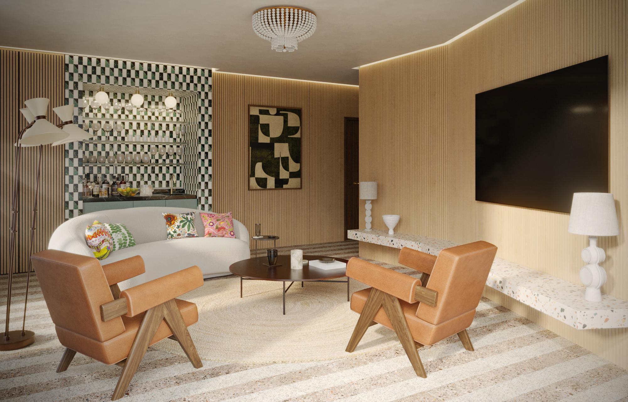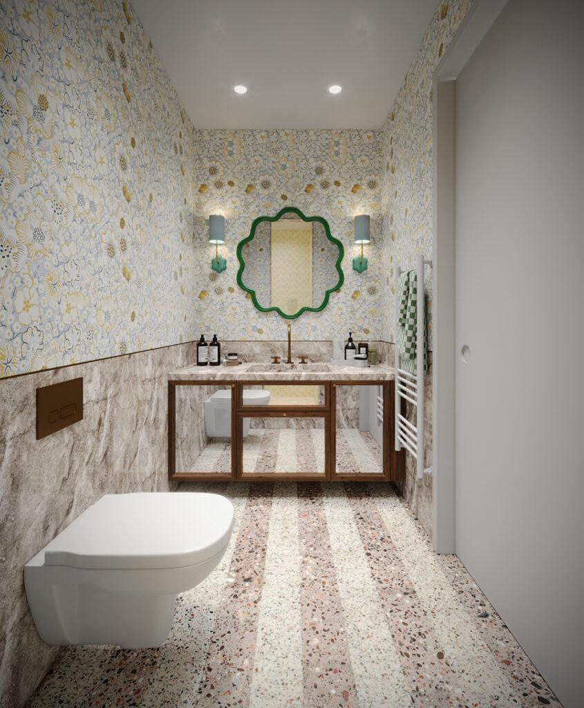 terrazzo flooring throughout the home, using a base of natural tones complemented by pops of colour and visually arresting bursts of pattern that surprise and challenge.