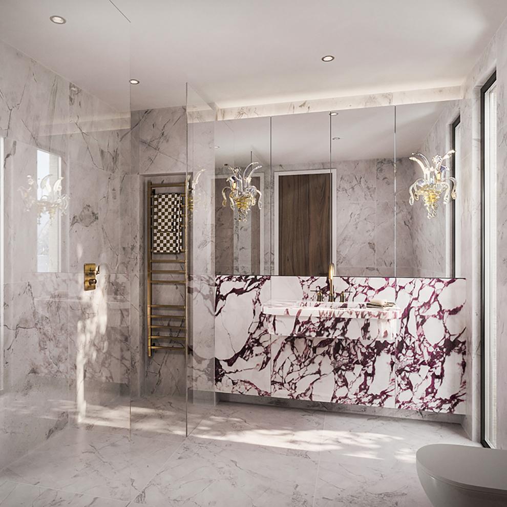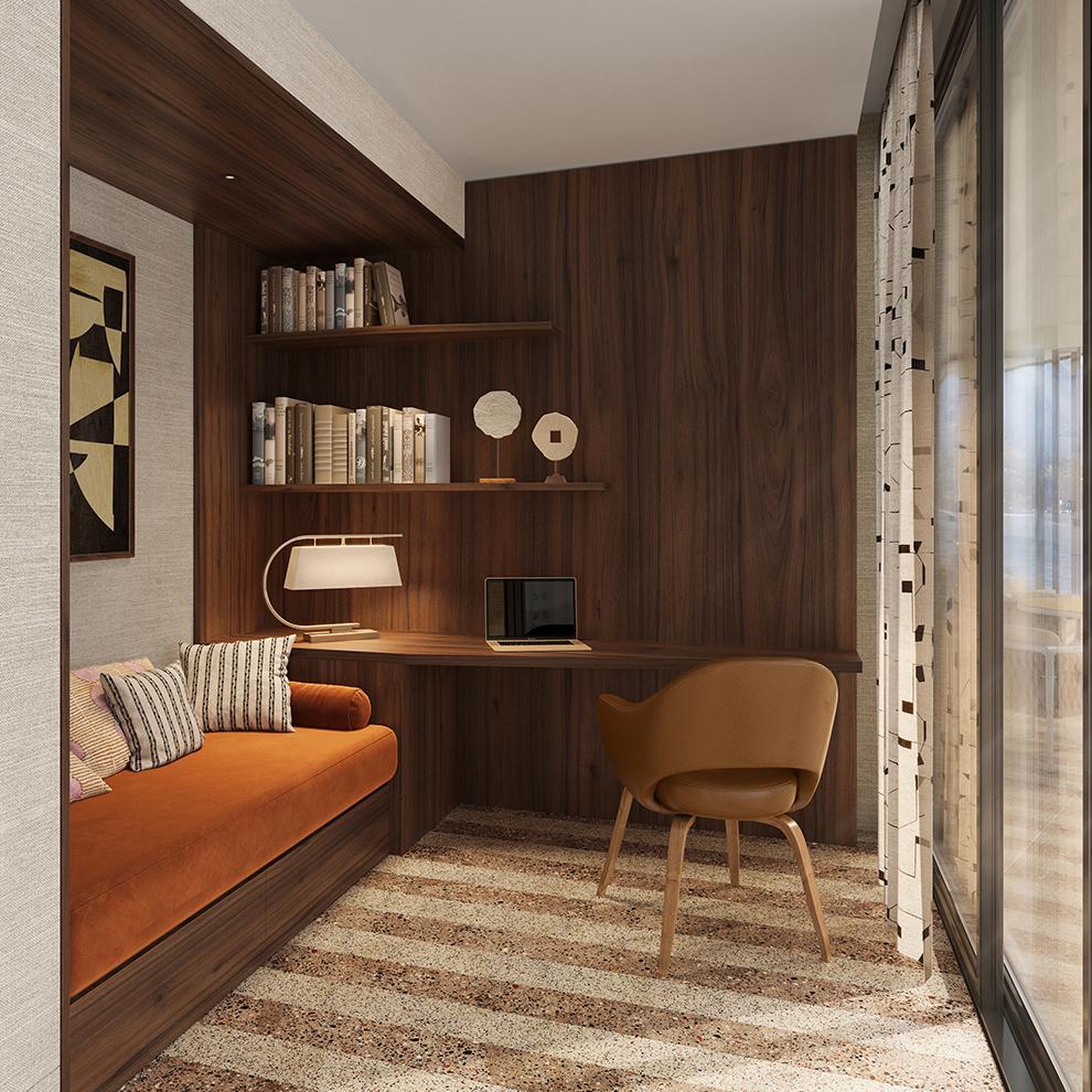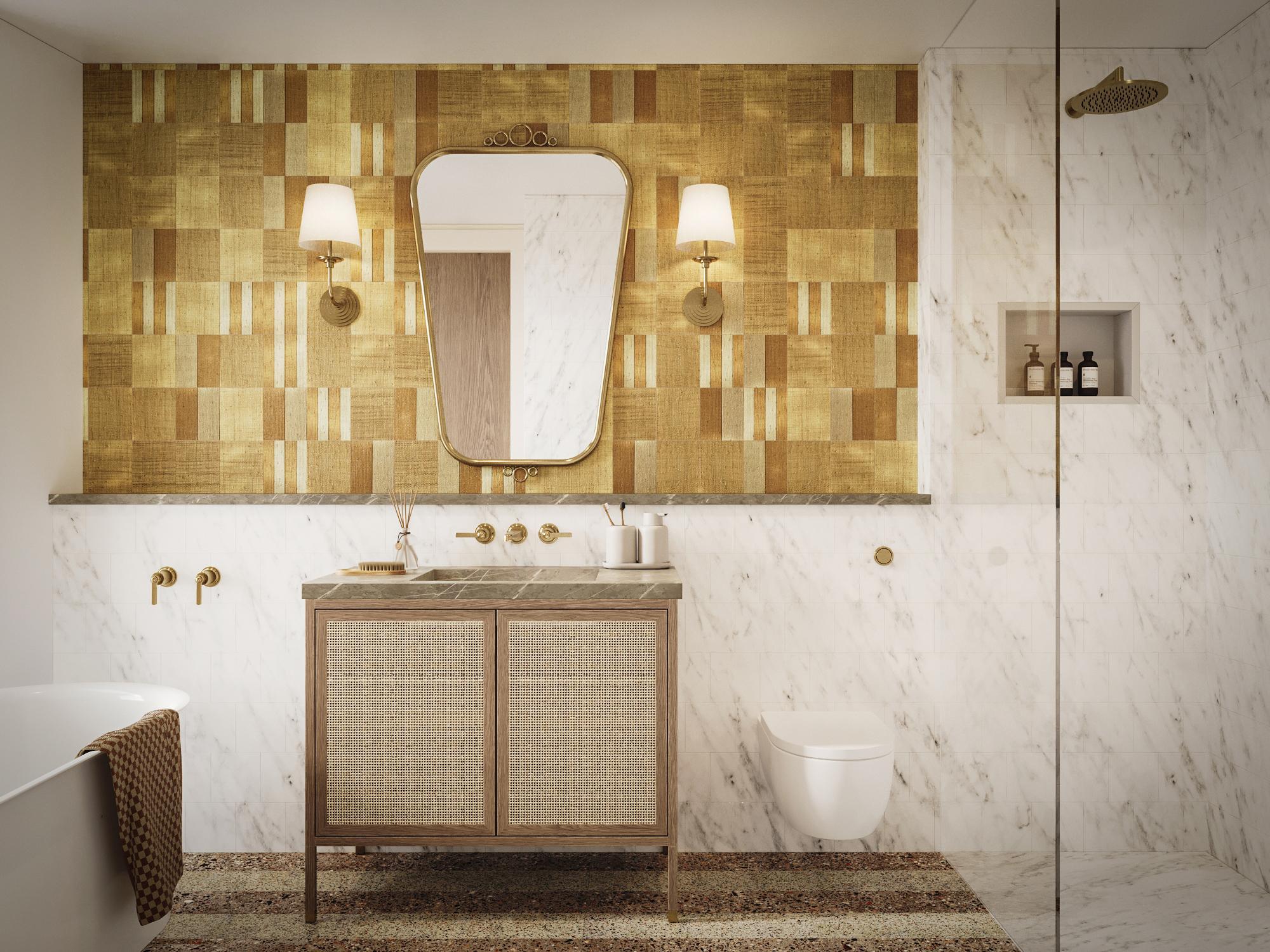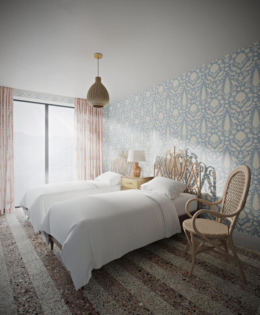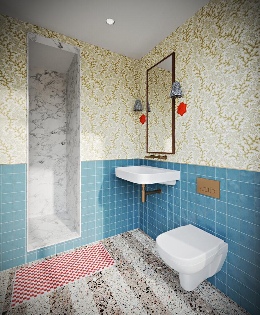 terrazzo flooring throughout the home, using a base of natural tones complemented by pops of colour and visually arresting bursts of pattern that surprise and challenge.
